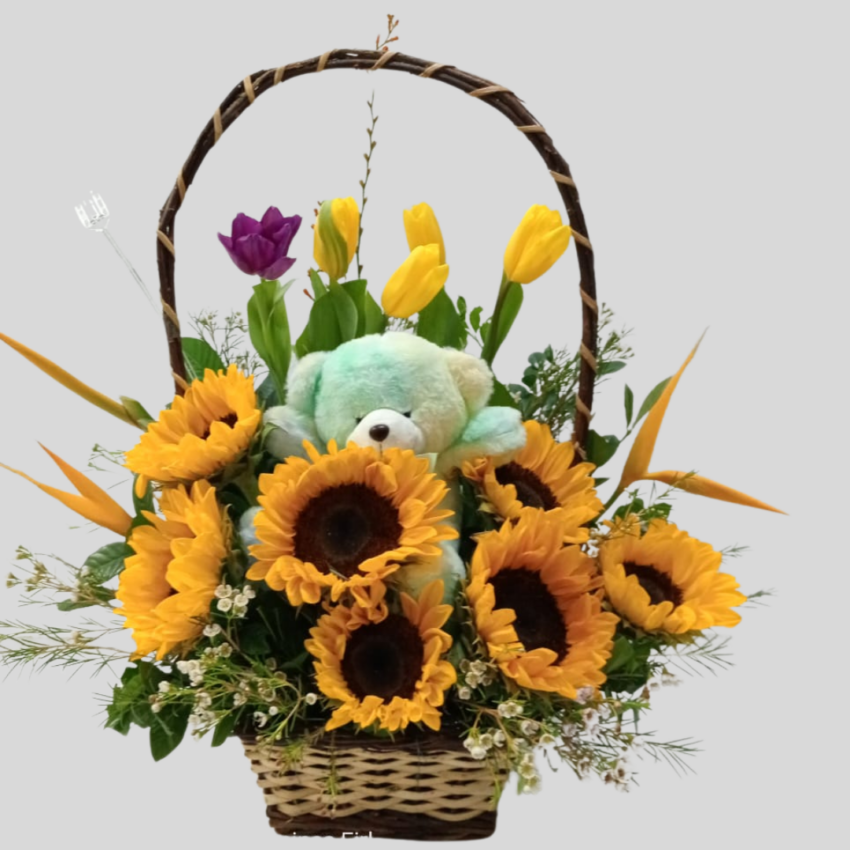Arreglo en canasta con 7 Girasoles, 5 tulipanes y decoracion.